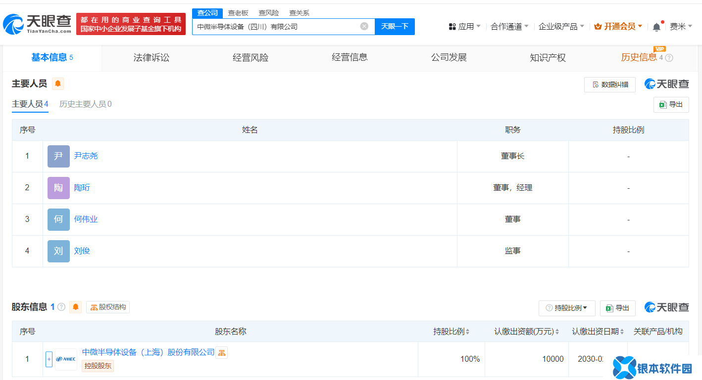 天眼查App显示,近日,中微半导体设备(四川)有限公司成立,法定代表人为尹志尧,注册资本1亿人民币,经营范围含半导体器件专用设备制造、半导体器件专用设备销售、电子专用设备销售、电子专用设备制造、半导体照明器件制造、电子元器件制造等,由中微公司(688012)全资持股。
