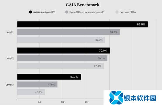 Manus还声称,在GAIA Benchmark(盖亚基准)测试中,其工具在所有三个难度级别上都实现了最先进的性能,超越了OpenAI。