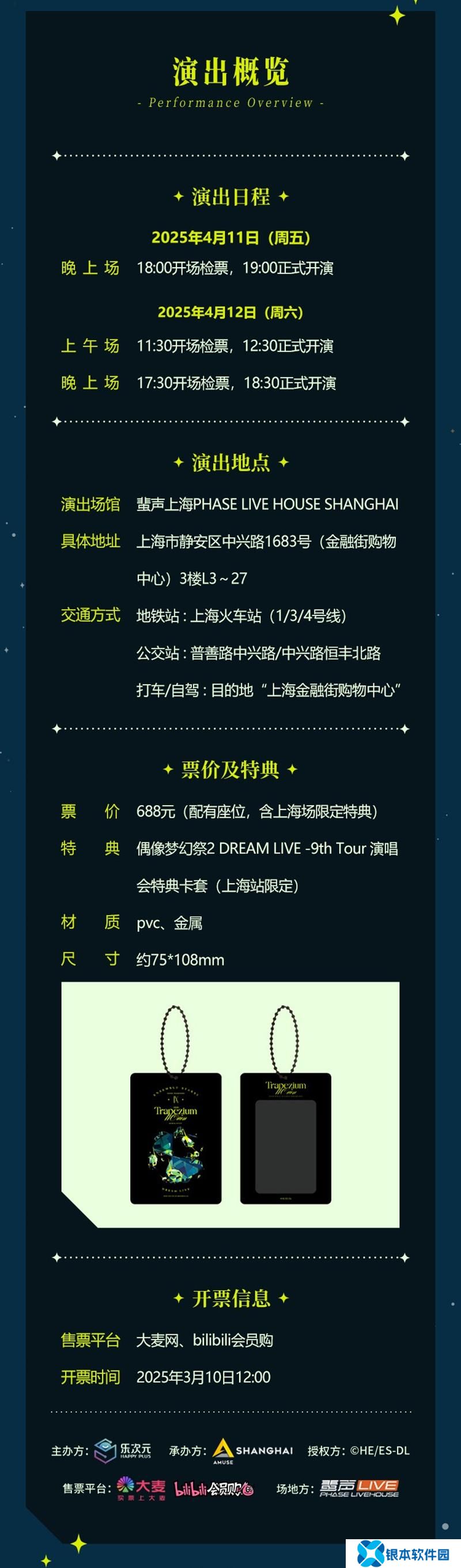活动名称:偶像梦幻祭2 DREAM LIVE 9th Tour 上海站演出形式:线下Live演出特别福利:上海站限定特典——演唱会特典卡套(材质为PVC、金属,尺寸约75×108mm)