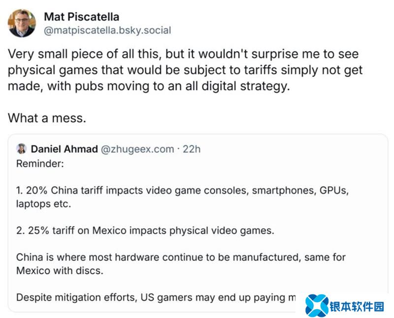 Circana分析师马特·皮斯卡特拉在Bluesky上表示,从墨西哥进口实体商品的成本增加可能会促使发行商远离实体游戏。