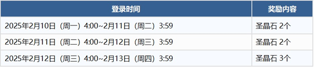 第1天(2月10日4:00~2月11日3:59): 圣晶石 ×2第2天(2月11日4:00~2月12日3:59): 圣晶石 ×2第3天(2月12日4:00~2月13日3:59): 圣晶石 ×3
