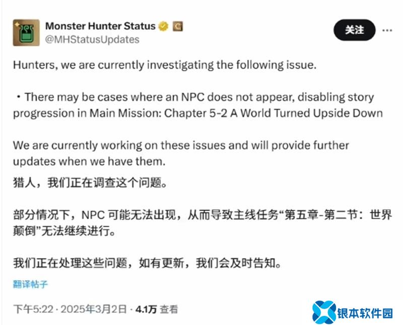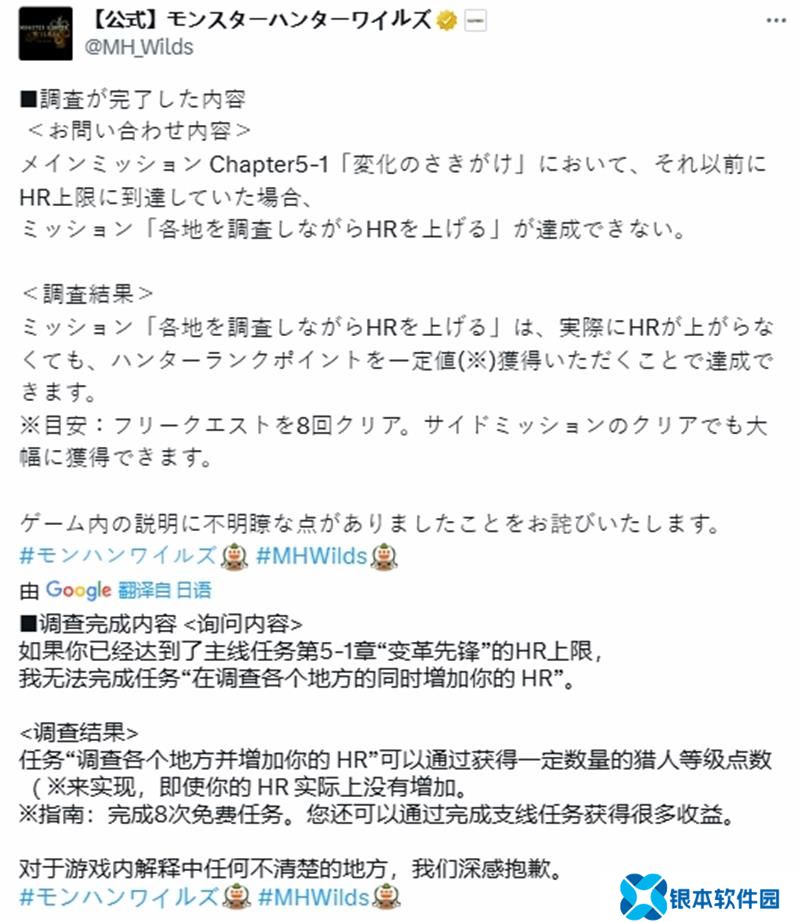 除外后续官方还提到,如果玩家在到达主线“5-1”章节时,猎人等级(HR)已达到了上限,将无法完成任务“调查地区并提高您的HR”导致卡关。对此官方表示,即使HR没有显示提升,但仍可以通过完成自由任务或支线任务来推进进度,大约需要8个任务就可以完成这一章节。