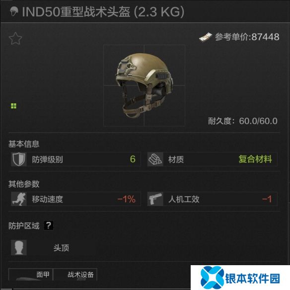 60耐久,头顶防护,最高加装四级面罩,六级的T7架子,它出现必有T7,材料还行而且负面扣除很少,非常不错的选择。