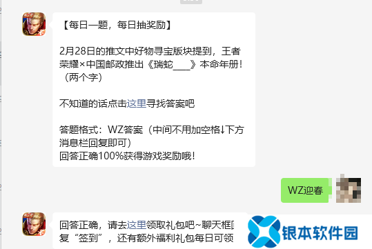 问题:2月28日的推文中好物寻宝版块提到,王者荣耀×中国邮政推出《瑞蛇____》本命年册(两个字)。