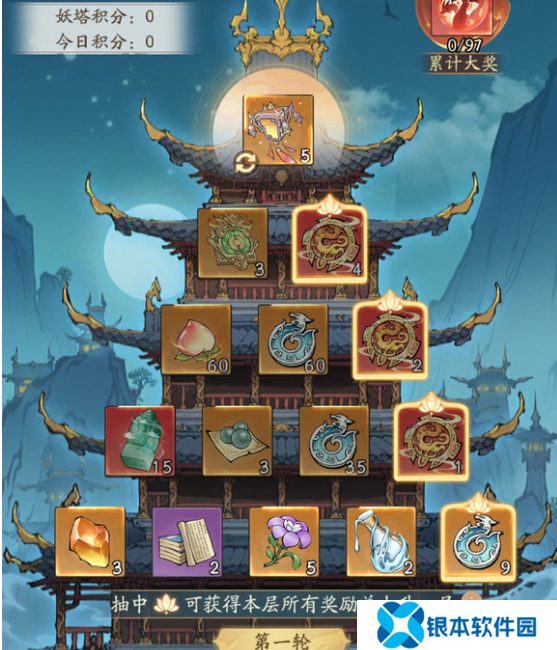 2、抽奖机制:使用妖塔玉令进行抽奖,宝塔共有141轮,每一轮都可以选取一个中心大奖,根据轮数的不同,可以选取的奖励也不同,每轮分为五层。