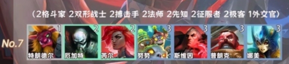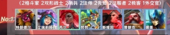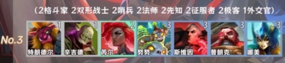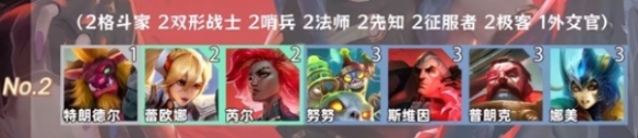 2、羁绊组成:2格斗家、2双形战士、2哨兵、2法师、2先知、2征服者、2极客、1外交官