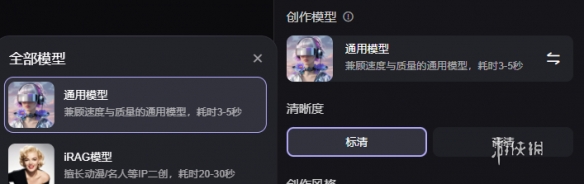 1、创作模型:创作模型分为通用模型和iRAG模型,两者的主要区别在于画风,根据需求进行调整即可。