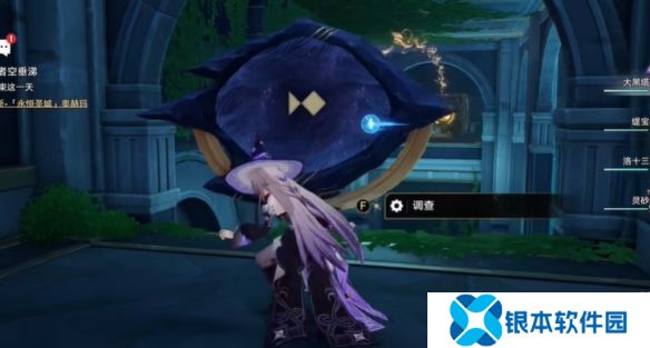 4、在左手边找到机关并点击调查,按照图中提示完成解密,到达对面。