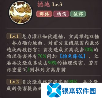 技能描述:龙力灌注如伏魔锤,玄离举起双锤奋力砸向地面,对前方直线范围内敌方造成两段伤害;首次造成玄离攻击70%的物理伤害并有70%附加【物免降低】,之后再次造成其攻击90%的物理伤害,若目标重量<3则拉到玄离身前