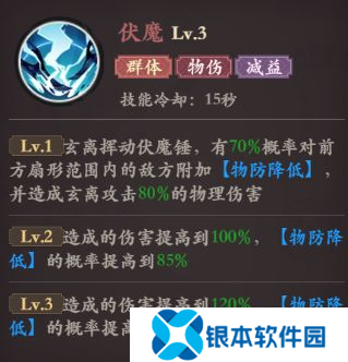 技能描述:玄离挥动伏魔锤,有70%概率对前方扇形范围内的敌方附加【物防降低】并造成玄离攻击80%的物理伤害