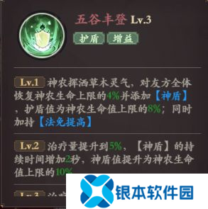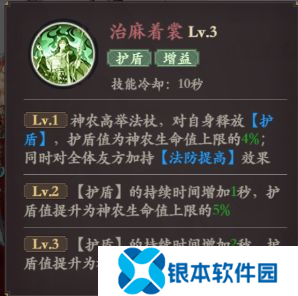 技能描述:神农挥洒草木灵气,对友方全体添加【神盾】,护盾值为神农生命值上限的4%,并恢复目标神农生命上限的8%;同时加持【法免提高】