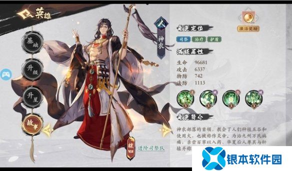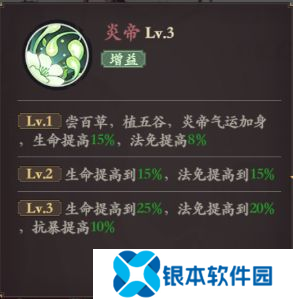 技能描述:尝百草,植五谷,炎帝气运加身,生命提高15%,法免提高8%