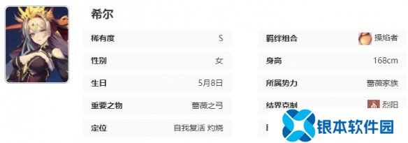 以荆棘与火焰,捍卫蔷薇的高傲,提高25%攻击和15%生命,希尔在场时,已方造成的灼烧伤害提高,提高值为希尔攻击的5%。