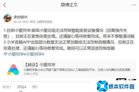 小米社区的知名用户@凌世锦华也对此事发表了看法。他表示,目前小爱同学以及超级小爱确实存在无法控制智能家居设备的情况,用户在尝试操作时系统会回复“操作失败”。同时,他还提到小米音箱App也出现了部分数据无法正常加载或无法控制音箱的问题。不过,他也安抚用户称,这些问题都在紧急排查处理中,并且在此期间,用户仍然可以通过语音正常控制音箱。