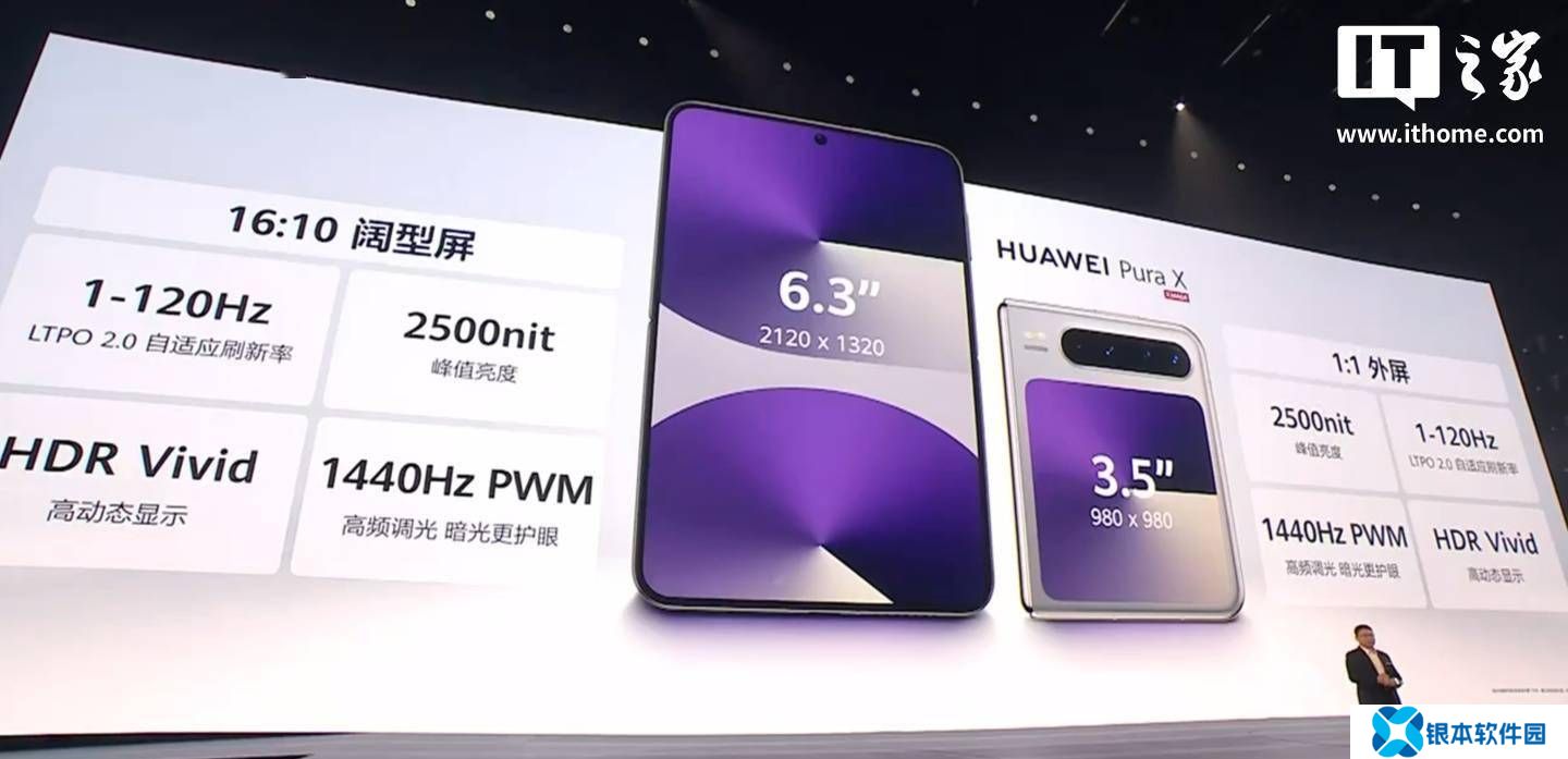 屏幕方面,华为Pura X配备了3.5英寸的外屏,采用1:1的比例,分辨率达到980x980,并支持1至120Hz的LTPO 2.0自适应刷新率,峰值亮度高达2500尼特,同时支持HDR Vivid和1440Hz PWM调光。内屏则是一块6.3英寸的16:10阔型屏,同样具备出色的显示效果和刷新率特性。