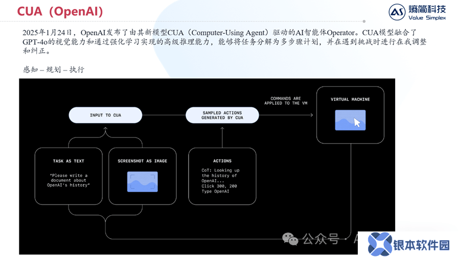 与此同时,OpenAI推出的CUA模型也引起了广泛关注。CUA模型融合了GPT-4o的视觉能力和强化学习实现的高级推理能力,能够自主操作电脑,完成任务分解、计划制定和自我调整等一系列动作。CUA的运作原理非常直观,它同时接受文本指令和屏幕截图两种模态的输入,生成一系列动作指令,如点击屏幕上的特定点、输入文字等。电脑接收到指令并完成操作后,将新的屏幕截图和任务指令返回给CUA,如此循环往复直至获得最终答案。