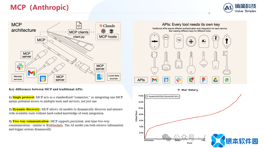 为了从根本上解决Manus等工具不足的问题,Anthropic推出了MCP协议。MCP定义了应用程序和AI模型之间交换上下文信息的方式,使得开发者能够以一致的方式将各种数据源、工具和功能连接到AI模型。MCP之于AI,类似于TCP/IP之于互联网,它为AI模型提供了统一的通信接口,从而打开了Agent能力的天花板。随着越来越多的工具和服务接入MCP协议,未来AI能够直接调用的工具将呈现指数级增长。