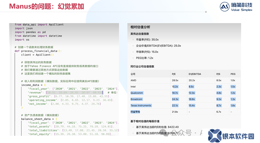 然而,尽管Manus展现出了巨大的潜力,但它仍存在一些不足之处。其中最显著的是“幻觉累加”问题。由于Agent本质上是多次大模型问答的串并联,如果单次问答的准确率不高,多次串联后最终回答的准确性将大幅下降。Manus在任务执行过程中还出现了数据硬编码错误等问题,这在一定程度上影响了其工作效果。