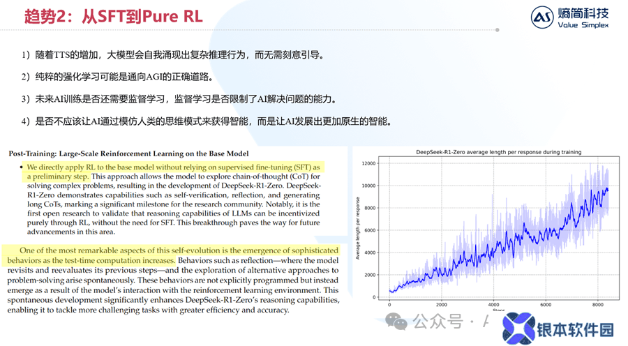 DeepSeek R1的论文也提到了后训练将成为大模型训练管线中的重要组成部分。这一观点已经逐渐成为行业共识。数据被视为AI时代的化石燃料,因为人类只有一个互联网。因此,如何高效利用有限的数据资源,成为AI发展的关键问题。强化学习在后训练中扮演了重要角色,它能够使大模型在自我涌现复杂推理行为的过程中,逐渐从“快思考”转变为“慢思考”,从而更准确地解决问题。