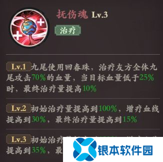 技能描述:九尾使用回春珠,治疗友方全体九尾攻击70%的血量,当目标血量低于25%时,最终治疗量提高10%