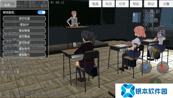 玩法:很普通的玩法,无僵尸模式,照着课表上课,吃东西,上社团活动,加入或退出社团,和学生老师互动,攻略学生并和学生恋爱,爬山玩水,開車,等…… .。