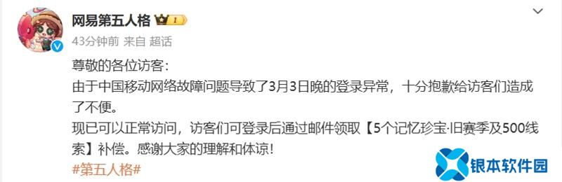 尊敬的各位访客:由于中国移动网络故障问题导致了3月3日晚的登录异常,十分抱歉给访客们造成了不便。现已可以正常访问,访客们可登录后通过邮件领取【5个记忆珍宝·旧赛季及500线索】补偿。感谢大家的理解和体谅!