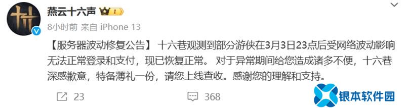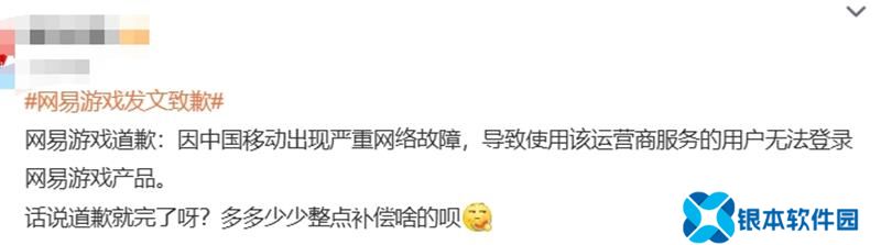 在公告中,官方表示,自3月3日22点开始,因中国移动出现严重网络故障,导致使用该运营商服务的用户无法登录网易游戏产品。经技术部门与中国移动紧急沟通处理,受影响的网易游戏产品服务均已恢复。给您带来不便,深感抱歉。