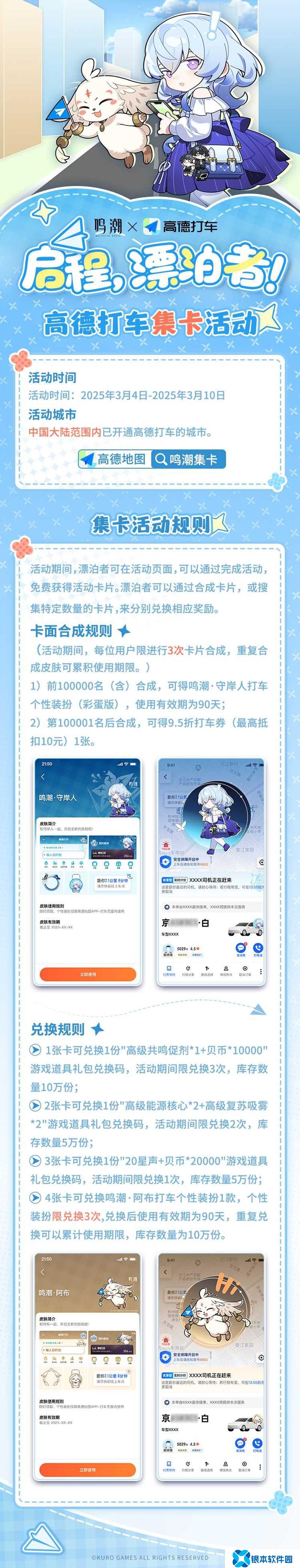 高德打车集卡活动:前往高德地图APP,搜索框输入【鸣潮集卡】,即可参与鸣潮主题集卡活动。集卡活动可获得【鸣潮·守岸人打车个性装扮】、【鸣潮·阿布打车个性装扮】以及游戏道具等奖励。
