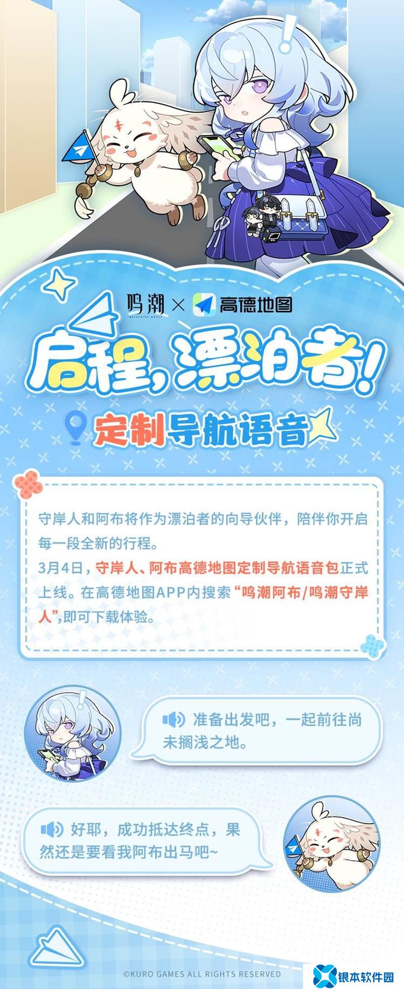 定制导航语音:前往高德地图APP,搜索框输入【鸣潮阿布】或【鸣潮守岸人】,或在高德地图内前往【我的】→【语音包】,搜索“鸣潮”,即可免费解锁。