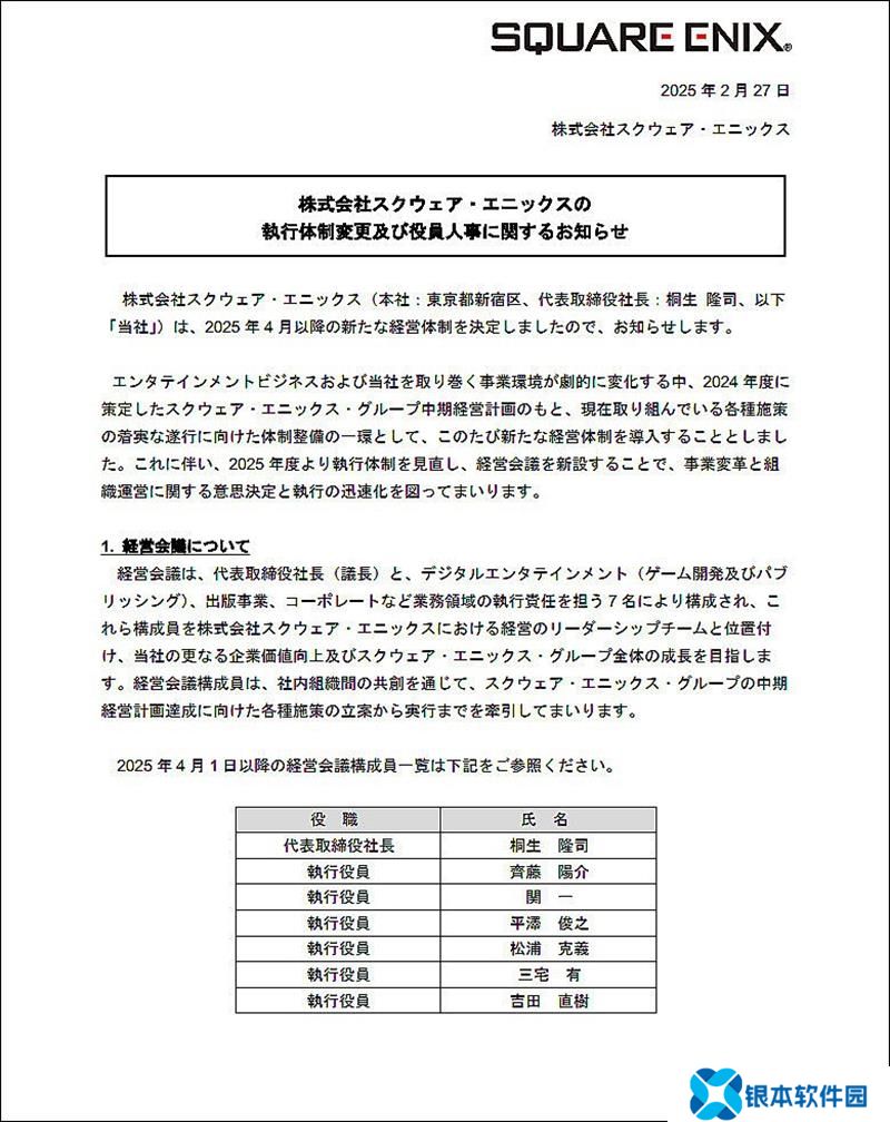 根据公告,自4月1日起,Square Enix的董事会成员将仅由桐生隆司、北濑佳范和三宅有组成,其余管理人员均调整为执行董事(執行役員)。这一调整标志着公司在治理结构上的重新定位,意在更高效地推进企业战略和游戏业务的发展。