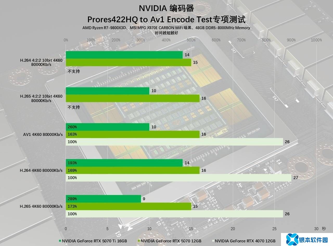 值得一提的是,GeForce RTX 50系显卡还能够支持4:2:2色度取样的视频编解码,这将节省CPU的负担,加快创作速度。上面的图表里也可以看到我们的测试成绩,实测导出时间会比上代显卡快不少,毕竟RTX 40系显卡不支持该功能,仅支持4:2:0色度采样,如果一定要4:2:2导出只能靠CPU软解。