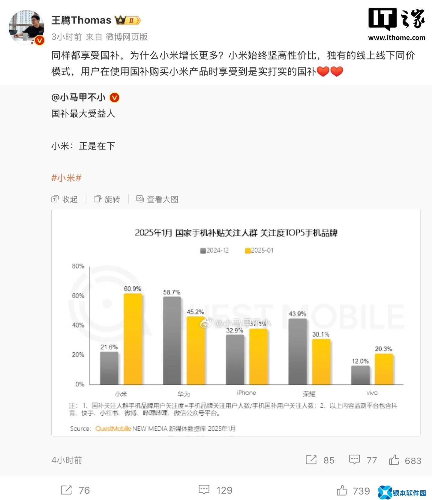 近期,国家大力推行多项产品补贴政策,引发了广泛关注。小米中国区市场部掌舵人、REDMI品牌负责人王腾,借助QuestMobile的数据统计,揭示了小米品牌在手机补贴市场中的显著地位。数据显示,截至2025年1月,小米品牌在享受国家补贴的手机市场中,关注度位居榜首。更令人瞩目的是,小米手机的市场份额自去年12月的21.6%,激增至60.9%。