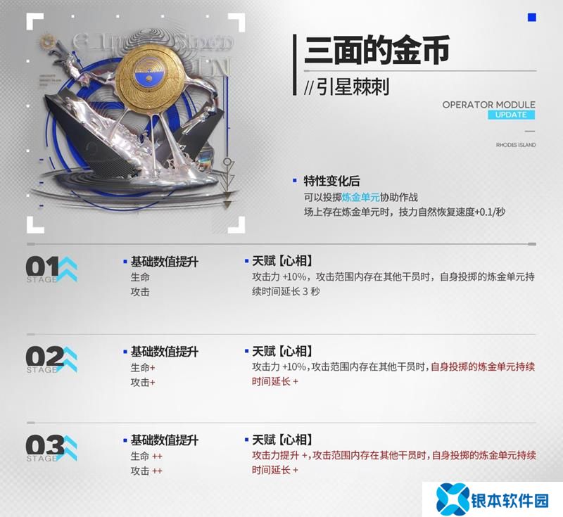 天赋【心相】 攻击力+10%,攻击范围内存在其他干员时,自身投掷的炼金单元持续时间延长3秒